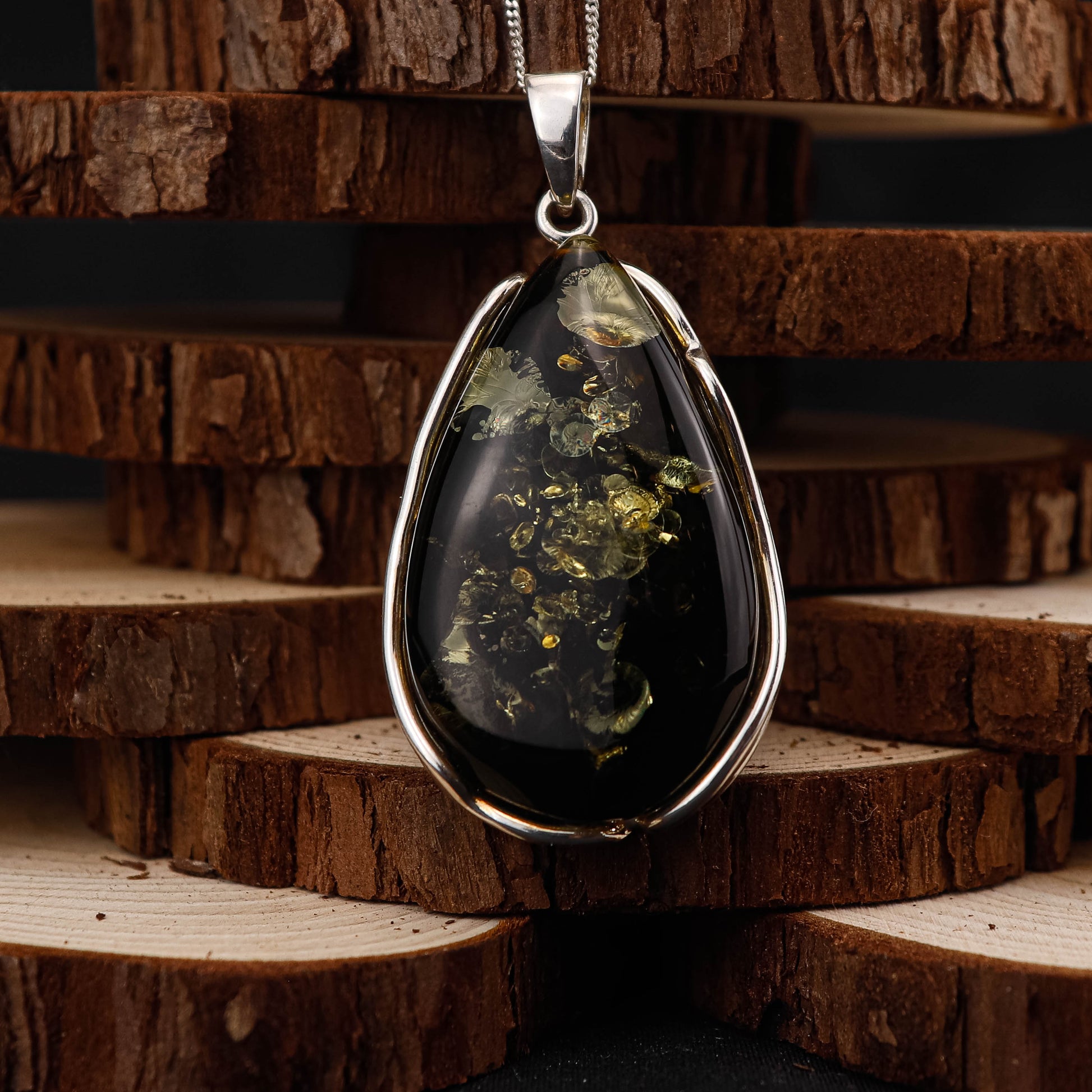 silverhänge bärnsten, mörk bärnsten halsband, baltisk bärnsten silver, droppformat bärnstenshänge, svart bärnsten silver, stor bärnsten hänge, 925 sterling silver halsband, exklusivt silversmycke dam, bärnsten halsband silver, present smycke silver