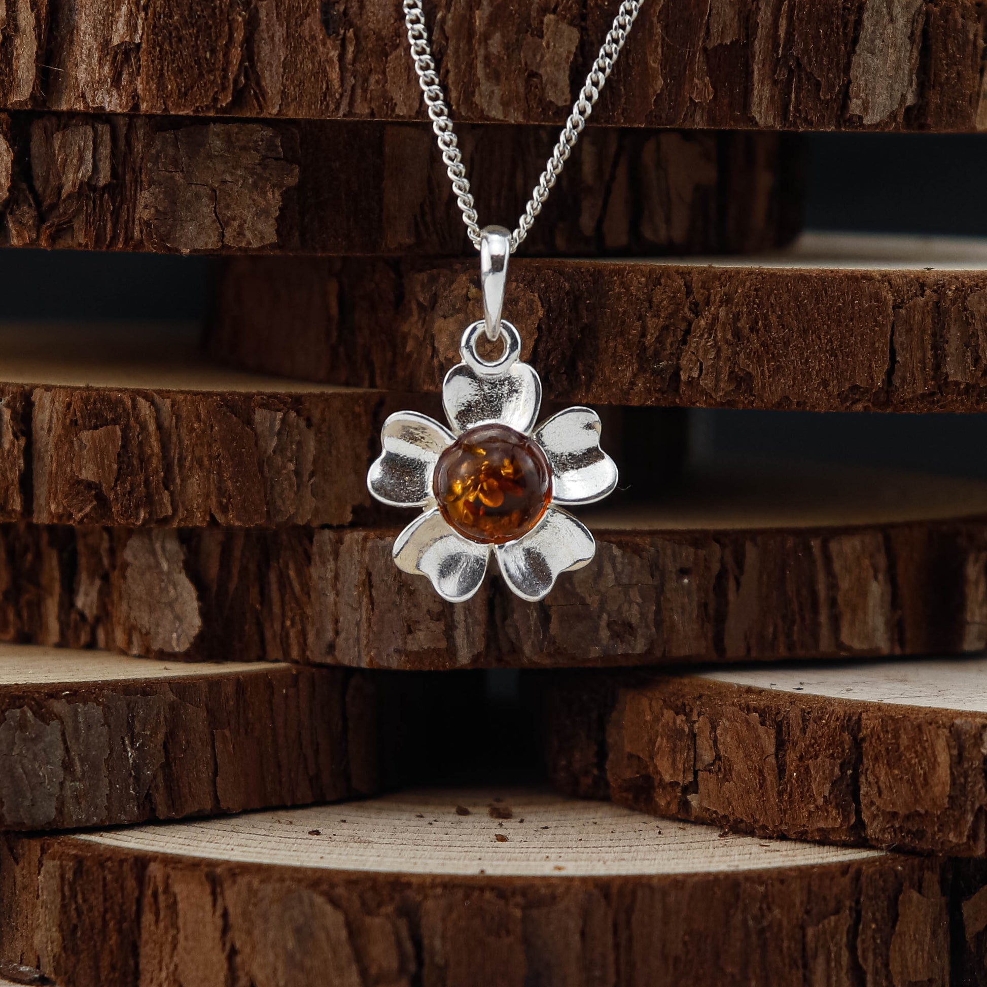 Den blommiga designen i silver ger ett lekfullt men ändå stilrent intryck, medan bärnstenen i mitten fångar ljuset och skapar värme. Ett halsband som passar lika bra till vardags som till fest och som enkelt kan matchas med andra silversmycken.