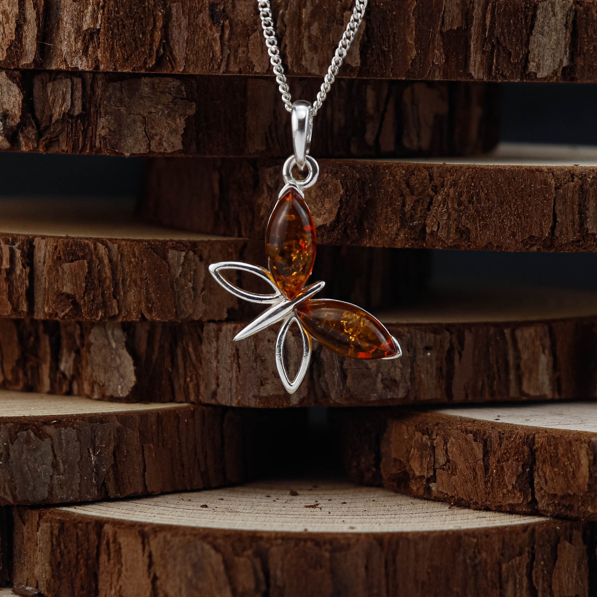 Amber Butterfly är ett lätt och elegant halsband med äkta baltisk bärnsten i varm cognacsfärg. Formen påminner om en fjäril i rörelse, med mjuka linjer i 925 sterling silver som ramar in bärnstenen på ett fint och luftigt sätt.