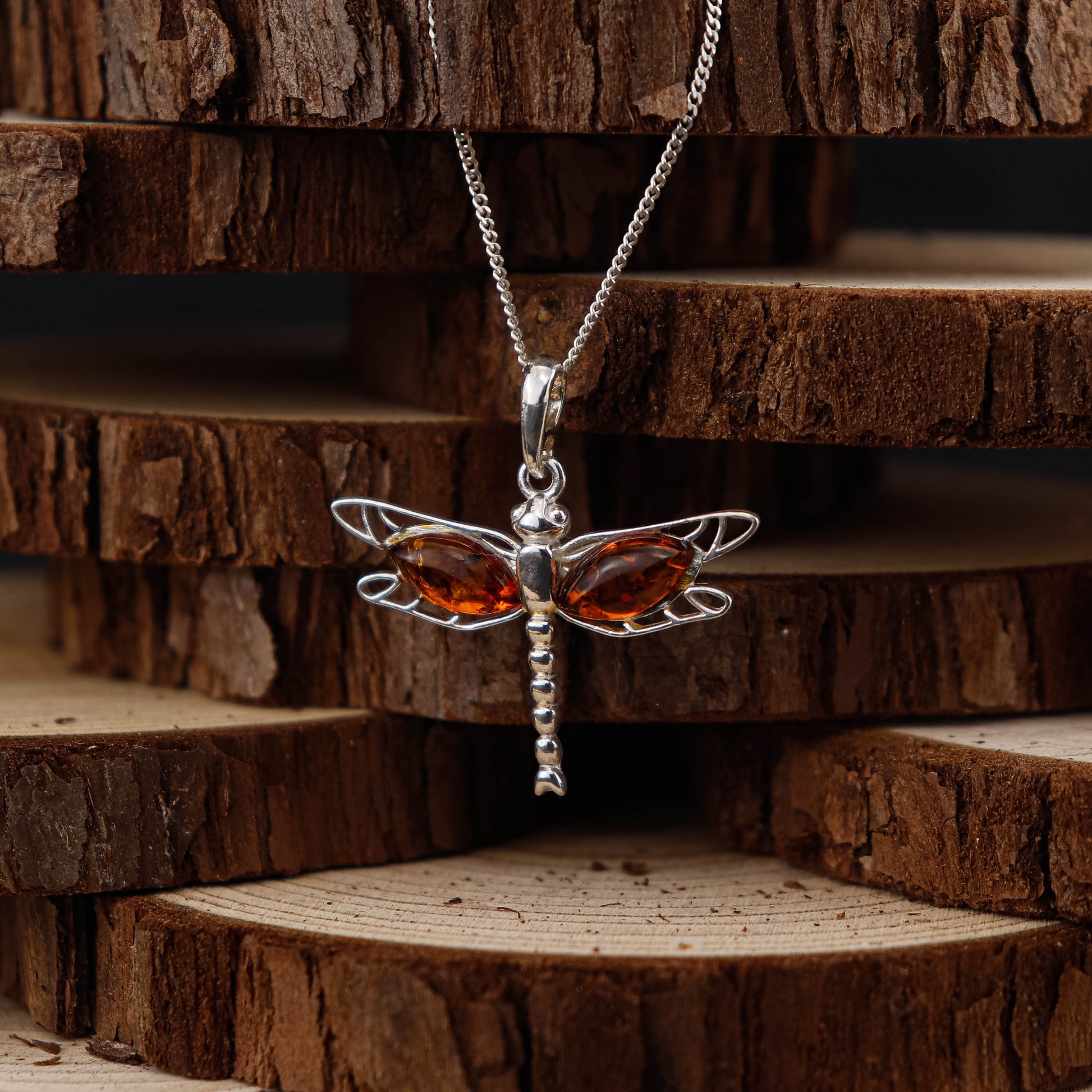 Design: Naturinspirerad trollslända med eleganta vingdetaljer och varm cognacfärgad bärnsten.