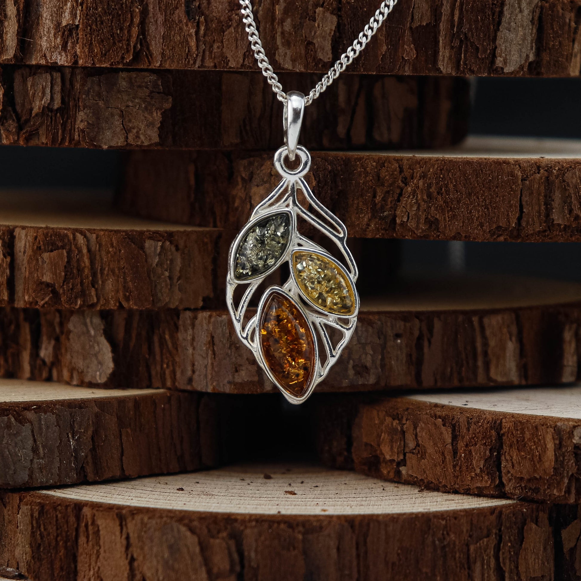 silverhänge bärnsten, äkta baltisk bärnsten, flerfärgad bärnsten, bladhänge silver, halsband bärnsten silver, 925 sterling silver hänge, silversmycken dam, present smycke silver, bärnsten halsband